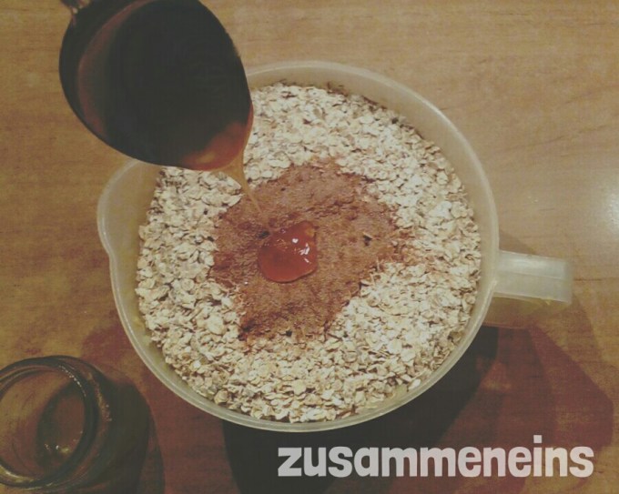 Die Haferflocken werden zusammen mit den geriebenen Äpfeln, Zimt und Honig in eine Schüssel gegeben und zusammengemischt.