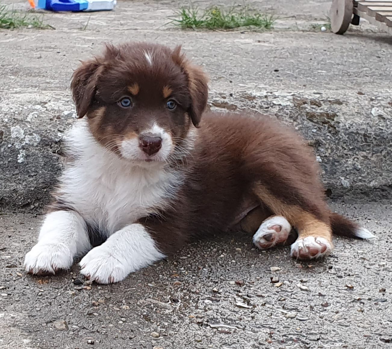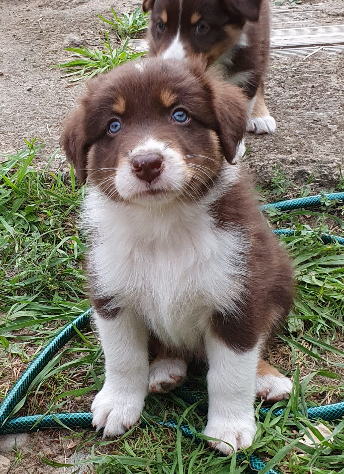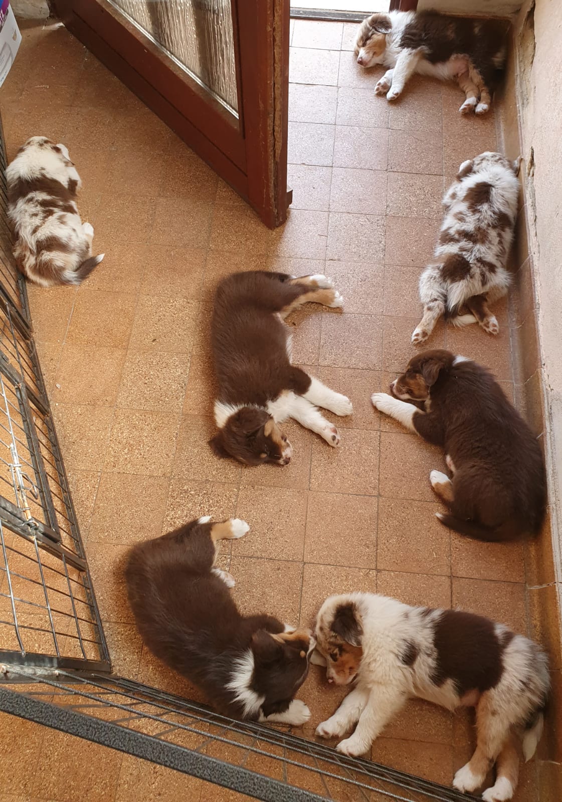 Eigentlich war für mich das Thema Welpe an diesem Punkt für mich mehr oder weniger durch, da ich mich sehr auf den Welpen, trotz aller Bedenken, gefreut hatte. Dann kam es aber so, dass mir abends, kurz vor dem ins Bett gehen, eine Anzeige angezeigt wurde von einem Wurf der auch gar nicht so weit von uns entfernt sein sollte (mit ca anderthalb bis zwei Stunden Fahrt). So laß ich mir ganz interessiert die Beschreibung bei Kleinanzeigen durch, die sehr liebevoll geschrieben war, und sah das nur noch vier Welpen unreserviert waren. So fragte ich an, ob noch einer der red merle Hunde zu haben sei. Am nächsten Tag hatte ich leider noch keine Antwort im Postfach und sah, dass die beiden red merle Hunde schon vergeben waren es waren jetzt noch zwei red tris über (welche ich zuerst nicht so ansprechend fand, nun aber mega cool finde) und so entschloss ich mich kurzerhand bei der Züchterin direkt anzurufen da ich ihre Handynummer über Ihre Website herausfinden konnte. Ich führte mit ihr ein sehr nettes Gespräch. Zwei Tage später ging es dann für uns auf den Weg um die Kleinen anzugucken. Nachdem Fauxpas mit dem ersten Welpen war ich hier doch vorsichtiger. Meine Bedenken hatten sich jedoch nicht bestätigt. Wir wurden super lieb bei den Züchtern empfangen und man merkte sofort, dass dies nicht der erste Wurf ist den sie aufziehen. In dem Wintergarten, wo die kleinen mit ihrer Mama in einem umzäunten Teil waren, war es sehr hundegerecht eingerichtet. Generell war die Stimmung sehr entspannt und harmonievoll. Wir waren über zweieinhalb Stunden bei den Kleinen und konnten und durften alles fragen was wir wollten. Die Welpen wurden zu diesem Zeitpunkt zweimal täglich gewogen, um zu kontrollieren ob sie genug zu sich nehmen. Die Züchterin erklärte uns wie die kommenden Wochen gestaltet sind. Wie ich bereits in der Anzeige und auch der Website gelesen hatte starteten sie in der 5. Woche mit kleinen Ausflügen in der 6. Woche ging es an einen See und in der achten Woche sollten die Welpen geimpft und gechipt sein. Am Abholtag sollte jeder Hundebesitzer Besitzerin eine Leine ein Geschirr Spielzeug und Eintopf was nach Mama roch für die Welpen mitbekommen.