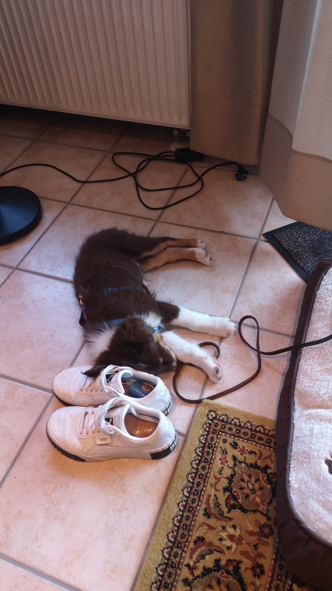 An diesem Tag waren wir alle super aufgeregt, vor allem Simba, der uns knappe 50 Minuten auf der Autofahrt ins Ohr gebellt hat (danach war er dann sehr müde und hat die restliche Fahrt geschlafen). Als wir ankamen wurden wir wie immer freundlich begrüßt und unterhielten uns. Wir bekamen alle Papiere, auch noch einmal die Werte der Eltern in einer extra Mappe, sowie die bereits in der Anzeige angegebenen Sachen wie Leine und Futter, etc. Nach der Verabschiedung ging es dann für Simbi, meinen Freund und mich mit einem Zwischenstopp bei seinen Eltern, wo Simba fressen konnte, nach Hause.
